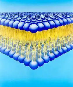 La membrane lipidique de l'enveloppe virale consiste, comme toutes les membranes cellulaires, en une double couche de phospholipides. Ceux-ci possèdent une tête hydrophile, qui forme des deux côtés la surface de la membrane, et deux chaînes carbonées hydrophobes dirigées vers l'espace entre les deux couches. Les phospholipides entrant dans la structure de l’enveloppe virale sont la phosphatidylcholine ou lécithine, la phosphatidyléthanolamine, la phosphatidylsérine, le phosphatidylinositol et la sphingomyéline. Les trois derniers ne se trouvent pour l'essentiel que dans la couche externe de la membrane. Aux phospholipides s'ajoute encore une grande fraction de cholestérol[14]. Les membranes cellulaires, et ainsi également les enveloppes virales, varient dans leur composition en phospholipides et cholestérol. Une grande teneur en cholestérol est typique pour les membranes cellulaires, tandis que les membranes du réticulum endoplasmique et de l’appareil de Golgi n'en contiennent que peu. Le taux de cholestérol d'une membrane est exprimé en quotient C/P (quotient molaire cholestérol/phospholipides). Il influe de façon décisive sur la morphologie de la membrane. Les membranes riches en cholestérol (quotient C/P typiquement de 0,4 à 0,8) sont plus stables, moins flexibles et, avec une épaisseur de 5 à 6 nm, environ un tiers plus épaisses que les pauvres en cholestérol[15]. Comme la composition en lipides d'une enveloppe virale est en première approximation celle de la membrane cellulaire originale, on peut retrouver entre les enveloppes virales cette différence selon qu'elles proviennent de la membrane cellulaire externe ou de systèmes membranaires intracellulaires.