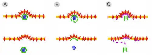 À côté du cas particulier des protéines GAG des rétrovirus, il y a trois autres variantes importantes pour le bourgeonnement (voir figure). La voie la plus simple est une légère courbure de la membrane par interaction des protéines d'enveloppe au moyen de leurs domaines d'ancre. Une capside terminée se lie à ces protéines agrégées et poursuit le bourgeonnement par l'interaction avec les protéines d'enveloppe (figure, cas A). Dans un deuxième cas (B), la construction de la capside n'a lieu que par la liaison avec les protéines d'enveloppe. L'interaction entre protéines de capside et protéines d'enveloppe rend possible d'abord l'intégration de l'acide nucléique, puis la complétion du virus pendant la fin du bourgeonnement. Cette variante peut aussi être complétée par une protéine de matrice entre l'enveloppe et la capside. Chez les virus qui n'ont pas de capside symétrique (par exemple le virus de la diarrhée virale bovine et son cousin le virus de l'hépatite C), il suffit de liaisons entre l'acide nucléique et des protéines basiques (p. ex. nucléoprotéines), qui à leur tour interagissent avec les protéines d'enveloppe, à l'intérieur de la membrane, comme le feraient des protéines de matrice.