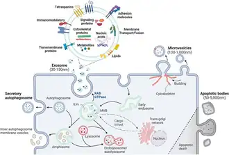 Les exosomes servent de véhicules de transport et d'expulsion de composants cellulaires. Les exosomes assurent les mêmes fonctions que leur cellule parentale. En outre, ils servent à la communication cellulaire en transférant des ARN messagers et des microARN[10] et peuvent par exemple jouer un rôle dans l'immunité cellulaire, comme pour le relargage de CMH II[11]. Les virus, comme les VIH utilisent aussi les exosomes à des fins de transport et de camouflage. Ces derniers participent également à la croissance des tumeurs[12] et pourraient contribuer à la genèse de la maladie d'Alzheimer[13].