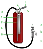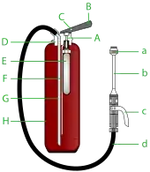 Un tuyau muni d'un diffuseur approprié à chaque agent extincteur permet d'en diriger la vidange. Une poignée permet de porter l'extincteur et, sur les modèles à pression auxiliaire :