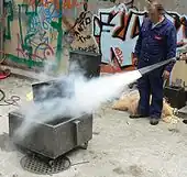 - s'il s'agit d'un extincteur à pression auxiliaire, il percute la poignée / bouton poussoir[11] pour libérer le gaz de la cartouche, en détournant le visage du flexible, et de la tête de l'extincteur;