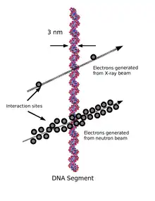 L'étude de l'effet des rayonnements ionisants sur les dommages de l'ADN montre que les dommages constatés sont de même nature que ceux que subissent spontanément les cellules, mais dans des proportions différentes. L'exposition d'une cellule à des rayonnements ionisants créé moins de lésions isolées et davantage de groupes de lésions (lésions en grappe), ce qui augmente la proportion de cassures double brin et de ponts ADN/ADN et ADN/protéine[72].