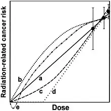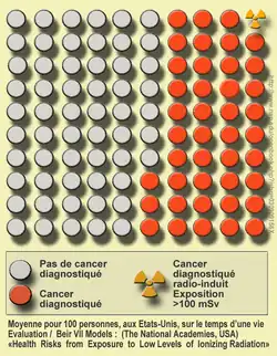 À partir des données sur les survivants des bombardements atomiques au Japon, il a été statistiquement établi qu'une exposition à un rayonnement de 2 sieverts (rayonnement gamma, uniformément réparti sur le corps, et reçu en quelques secondes) conduit à doubler le risque de mourir d'un cancer, c'est-à-dire engendre un « risque relatif » de deux[67]. C'est ce chiffre, associé à l'idée d'une relation linéaire entre dose et effet, qui est à la base de la « règle » qu'une exposition à 100 mSv conduit à un risque relatif de 1.05, ou encore (du fait que le risque « naturel » est de l'ordre de 20 %) qu'une exposition à 100 mSv entraîne une probabilité de 1 % de provoquer un cancer.