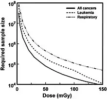 Ainsi, sur la base du modèle linéaire sans seuil, 500 personnes exposées suffisent , théoriquement, à détecter (8 fois sur 10) les effets d'une dose de 1 000 mSv. Pour détecter les effets d'une dose dix fois moindre (100 mSv),il faut une population exposée d'au moins 50 000 personnes. Et pour 10 mSv il faudrait une cohorte 100 fois plus grande (soit 5 millions de personnes exposées)[19].
