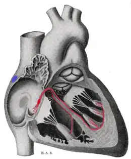 La branche droite descend le long du côté droit du septum interventriculaire pour se terminer dans le réseau de Pukinje du ventricule droit.