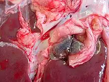 Une hypertrophie de la paroi des canaux biliaires est notée avec présence des douves à l'intérieur. Le foie peut-être hypertrophié ou au contraire atrophié. Il présente des lésions de cirrhose avec fibrose du parenchyme hépatique provoquée par la migration de jeunes douves.