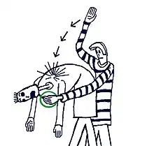 La première chose est de tousser. Si la victime est incapable de tousser, il faut utiliser[6] deux techniques manuelles: des "coups dans le dos" et des "pressions thoraciques anti-étouffement" (représentés ci-dessous). Pour de meilleurs résultats, on peut les combiner à tour de rôle: chaque technique est répétée environ 5 fois, et un changement est effectué en passant à l'autre technique, et les tours sont ensuite répétés en continu. (Voir les dessins ci-dessous).
