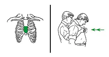 La première chose est de tousser. Si la victime est incapable de tousser, on peut utiliser[5] deux techniques manuelles: des "coups dans le dos" et des "pressions abdominales". Pour de meilleurs résultats, elles peuvent être combinées à tour de rôle: chaque technique est répétée environ 5 fois, et puis un changement est effectué en passant à l'autre technique, et les tours sont ensuite répétés en continu. (Voir les dessins ci-dessous).