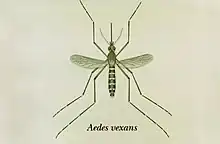 Il existe aussi, secondairement, un mode de transmission par moustiques. Plus d'une trentaine d'espèces sont impliquées : outre le genre Aedes, on trouve aussi les genres Anopheles, Culex et Mansonia. Par exemple Culex pipiens (Égypte 1977), Culex poicilipes (Mauritanie 1998), Aedes vexans (Péninsule arabique 2000)[3].