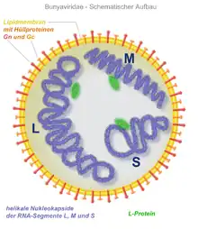 Les virions bunyavirus sont des particules enveloppées, à peu près sphériques, d'un diamètre de 70 à 120 nanomètres[6].