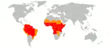 En 2016, la fièvre jaune est endémique dans 47 pays tropicaux d'Afrique et d'Amérique du Sud[25] représentant 900 millions d'habitants[26]. 90 % des cas surviennent en Afrique subsaharienne. Il existe des pays où la fièvre jaune est absente, mais susceptible de se propager à cause de la présence du moustique Ædes ægypti, ces pays peuvent exiger un certificat international de vaccination.