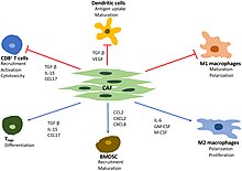 Les signaux d'activation des fibroblastes bien établis comprennent les médiateurs inflammatoires, le facteur de croissance transformant bêta (TGF-β) et l'acide lysophosphatidique qui augmentent l'activité des facteurs de transcription SMAD et stimulent l'expression de l'actine des muscles lisses alpha (α-SMA) qui transforme le fibroblaste en myofibroblaste). Les fibroblastes activés produisent des chimiokines et des cytokines pour réguler la communication avec d'autres cellules mésenchymateuses, épithéliales et immunitaires[9]. Toutes ces fonctions sont utilisées et améliorées dans le micro-environnement tumoral[10],[11].
