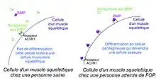 Dans le cas de la FOP, on suppose qu’il y aurait une surproduction de protéines BMP et une sous-production d’antagonistes de cette protéine. De plus, la mutation du gène ACVR1 entraînerait une augmentation du nombre de récepteurs aux BMP à la surface des cellules musculaires squelettiques. Ceci déclencherait chez ces cellules une différenciation en cellules cartilagineuses. Leur devenir est la transformation en cellules osseuses.