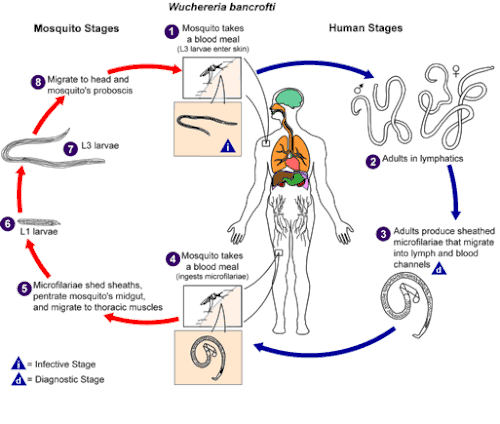 W. bancrofti effectue son cycle parasitaire chez deux hôtes. Les êtres humains jouent le rôle d’hôtes définitifs et les moustiques celui d’hôtes intermédiaires.