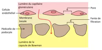 Elle s'effectue au travers de la paroi glomérulo-capillaire composée de trois couches : l'endothélium vasculaire, la membrane basale et l'épithélium urinaire.