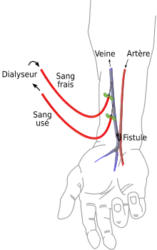 La fistule artério-veineuse est volontairement fabriquée par le chirurgien qui abouche une veine du bras dans une artère, ce qui a pour effet d'augmenter le débit à ce niveau (chute des résistances par shunt du réseau distal capillaire) et d'obtenir une dilatation veineuse importante et une augmentation de la résistance de la paroi de la veine (elle prend un aspect d'artère), pour permettre la pose ponctuelle de circuits de circulation extra-corporelle lors d'un traitement par hémodialyse. La fistule possède l'avantage sur le cathéter (posé obligatoirement sur une grosse veine centrale) de permettre la cicatrisation entre les séances – et par conséquent moins d'entrée de germes.