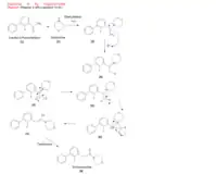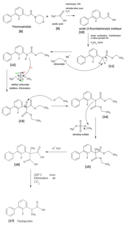 La synthèse historique, décrite par Stewart Adams (en), consiste en plusieurs étapes. Elle commence par une réaction de Willgerodt-Kindler avec un mélange de 3-acétyl-2-fluorobiphényl [1] et de morpholine [2] le tout chauffé à reflux. Une réaction de déshydratation donne le composé [3], puis le composé [4] après ajout de soufre. Des réarrangements donnent successivement les composés [5], [6] et [7]. Le composé [7] est en équilibre avec sa forme tautomère, le thiomorpholide [8][17].