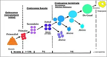 Dès la puberté, un certain nombre de follicules primordiaux vont grossir (par vagues de quelques dizaines chaque jour), pour donner une fois par cycle de 28 jours un follicule pré-ovulatoire, au sein duquel l'ovocyte I (bloqué juste après le stade diplotène, au stade dictyotène ou stade dictyé de la prophase I de méiose) reprendra sa méiose avant d'être expulsé du follicule ovarien lors de l'ovulation. On distingue plusieurs stades intermédiaires de développement folliculaire. L'ensemble de ces étapes est appelé folliculogénèse : la maturation d’une cohorte de follicules primordiaux qui dans la majorité des cas aboutira à l’ovulation d’un seul d’entre eux (durée d'environ 120j). À chaque étape, une partie des follicules engagés vont entrer en apoptose, on parle alors d'atrésie.