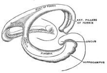 - les deux fimbriae : faisceaux situés latéralement qui tapissent l'hippocampe auquel elles se connectent.