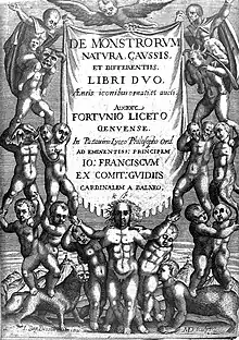 Liceti inclut dans les monstres, non seulement des êtres réels (du domaine de la tératologie au sens moderne), mais aussi tous les êtres fabuleux qui ont pu être signalés depuis l'Antiquité, comme les centaures, les hommes à tête de chien ou d'oiseau, ou ce fameux œuf de poule découvert en 1569 et qui contenait une tête d'homme avec une barbe et des cheveux de serpents, telle une méduse[1],[6].