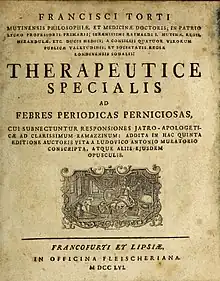 - ↑ L.A. Muratori, Francisci Torti medici mutinensis vita, dans F. Torti, Therapeutice specialis ad febres periodicas perniciosas, cui subnectuntur responsiones jatro-apologeticae ad clarissimum Ramazzinum…, Venetiis 1743, pp. IX-XXI.