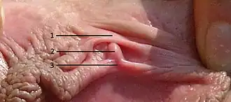Vulve ouverte montrant la partie externe du clitoris : le frein est numéroté 3.