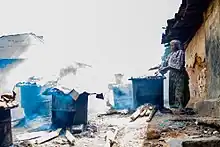 - Outre le CO2 et le CO asphyxiants, la fumée contient des dizaines à centaines de composés toxiques[5] source d'intoxication[6] ; l'inhalation de fumée est la première cause de décès lors d'un incendie. L'effet toxique peut persister après extinction de l'incendie. La fumée a une toxicité systémique[7]. La toxicité des feux ruraux ne doit pas non plus être sous-estimée (la paille et l'herbe sur pied peuvent aussi dégager en brûlant des composés cyanhydriques toxiques (lors d'un feu de chaume sur pied[8]). L'inhalation de fumée refroidie est pernicieuse car n'entraîne pas ou peu de sensation de gêne immédiate ou à court terme ; Le noir de carbone déposé par les fumées est cancérigène et de nombreuses particules déposées par les fumées sont toxiques (notamment en cas de combustion de déchets et de déchets industriels). Les fumées issues d'accidents nucléaires ou d'incendies de forêts contaminées par des retombées radioactives, après la catastrophe de Tchernobyl par exemple, sont aussi radioactives et responsables de ré-émissions et déplacements géographiques de radionucléides. D'autres cas particuliers sont par exemple ceux des fumées de combustion de pesticides[9], des fumées de tirs de munition ou d'explosif[10], des fumées de soudure (source de nanoparticules et de vapeurs métalliques[11],[12],[13]). Un simple feu de bois est source de produits toxiques et polluants[14].