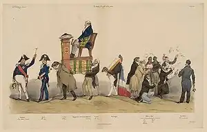 De gauche à droite : L'aspergeur, le général Georges Mouton ; le diacre, le général Jean-François Jacqueminot ; un président à cheval sur le règlement, Amédée Girod de l'Ain ; 1er porteur, Clément-François-Victor-Gabriel Prunelle ; 2e porteur, Benjamin-François Levrault ; un citoyen, le roi Louis-Philippe Ier, le visage caché par un livre ; les enfants de chœur, Jean Vatout, Auguste Hilarion de Kératry, Alphonse-Marie-Marcellin-Thomas Bérenger, Antoine Gabriel Jars, Alphonse Jacques Mahul, Auguste Victor Hippolyte Ganneron ; le sous-diacre.