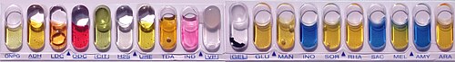 Ils sont remplis d'une suspension bactérienne calibrée (de densité différente selon la galerie). Pour les substrats dont le sigle est encadré, la cupule doit aussi être remplie de manière à créer un ménisque pour réaliser l'aérobiose. Pour les substrats dont le sigle est souligné, la cupule doit être remplie d'huile de paraffine soit pour créer l'anaérobiose (absence d'oxygène), soit pour maintenir en solution les molécules ou ions volatils produits par la réaction et ainsi assurer le virage de l'indicateur coloré de pH.