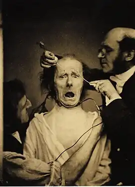- ↑ Tiré d'un ouvrage anonyme, Galvanische und elektrische Versuche an Menschen- und Tierkörpern. Angestellt von der medizinischen Privatgesellschaft zu Mainz, Francfort-sur-le-Main, Andreäische Buchhandlung, (lire en ligne), p. 45 et suiv. : Hirnhälften [wurden] bis zum größten Umkreise des Marks weggenommen. Die negative Kette wurde auf die eine, die positive auf die andere Hirnhälfte angebracht, und die große Flasche entladen. Auf die ersten Schläge entstanden starke Bewegungen in den Muskeln der Nase, des Mundes und der Backen. Auf die folgenden Schläge sah man mehrmals Bewegungen in den Muskeln des ganzen Gesichts.