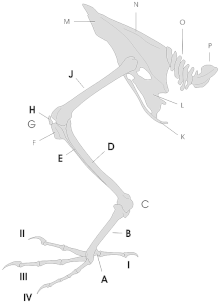 Chez les oiseaux, le « genou » est l'articulation entre le fémur (en position très oblique, proche de l’horizontale lorsque l'animal est au repos) et le tibiotarse. Plus antérieur, il se situe au niveau du centre de masse[3].