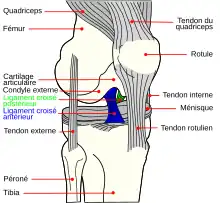 Le genou abrite l'articulation du genou. C'est une articulation synoviale qui relie le fémur, le tibia et la patella. Elle est constituée de deux articulations :
