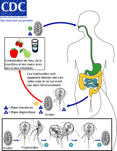 Le cycle parasitaire commence par un kyste non infestant éliminé dans les selles d’un individu infecté. Une fois dans l’environnement extérieur, le kyste devient infestant. Un caractère distinctif du kyste est qu’il possède 4 noyaux et un cytoplasme rétracté. Une fois ingéré par l’hôte, le trophozoïte arrive à un stade actif et il est capable de se mouvoir pour trouver sa nourriture. Il se nourrit aux dépens de la muqueuse à l’intérieur du tractus digestif et provoque chez l’hôte des douleurs épigastriques, une distension gazeuse excessive, une diarrhée graisseuse avec du mucus mais pas de sang. Ces symptômes peuvent durer 2 à 4 semaines mais pour un individu intolérant au lactose, les troubles peuvent persister jusqu’à six mois. Après l’étape de prolifération, le trophozoïte subit la phase de reproduction asexuée par scissiparité. Les trophozoites et les kystes résultants de la division traversent alors le système digestif et sont éliminés dans les selles. Les caractères distinctifs des trophozoïtes sont de grands caryosomes et le manque de chromatine périphérique, donnant aux deux noyaux l’aspect d’un halo. C’est une forme primitive de protozoaires à laquelle font également défaut les mitochondries.