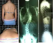 Patiente présentant une scoliose. La position penchée vers l'avant permet de mettre en évidence la gibbosité : sur la photo du bas, la déformation apparaît sous la forme d'une surélévation de la partie droite de la cage thoracique.