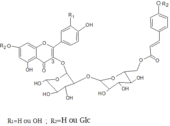 Les flavonoïdes sont représentés par une vingtaine d’hétérosides flavoniques, construits sur les trois génines suivantes : kaempférol, quercétol et isorhamnétol. Par exemple le quercétol est lié à un sucre pour former le quercétol-3-β-D-glucoside. D’une manière plus générale, les principaux hétérosides sont des o-glucorhamnosides en C-3 du quercétol et du kaempférol et leurs esters 4-coumariques en 6’’’[32].
