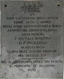 Giovanni Filippo Ingrassia naquit en 1510 à Regalbuto en Sicile. Il obtint son doctorat en 1537 à l'université de Padoue[2]. Sa renommée se répandit bientôt dans toute l’Italie, et il s’établit à Naples, où il professa la médecine et l’anatomie avec un grand succès. Ses remarques anatomiques sur Galien brillent par la justesse de ses expositions sur les os. Il paraît être le premier qui ait parlé de l’étrier, petit os de l’oreille interne. Les anatomistes les plus célèbres de ce temps-là ont eu la même prétention ; mais Fallope, moins avide de gloire qu’ami de la vérité, se dépouilla du mérite de la découverte qu’il croyait lui-même avoir faite, pour la restituer à Ingrassia. Nommé en 1563 proto-médecin de la Sicile et des îles adjacentes par Philippe II, roi d’Espagne, il profita des pouvoirs attachés à cet emploi pour rétablir l’ordre dans la principale branche de la médecine, en éloignant de la pratique ceux qui manquaient de capacité. En 1575, il délivra la ville de Palerme de la peste, et mérita le tire glorieux d’Hippocrate sicilien, que toute la ville lui décerna. Ce médecin, aussi savant que désintéressé, mourut à Palerme le 6 novembre 1580, à l’âge de soixante-dix ans. Il a laissé sur son art onze ouvrages, dont les plus estimés ont pour titre : Veterinaria medicina, Venise, 1568, et Commentaria de ossibus, Messine, 1603, in-fol.