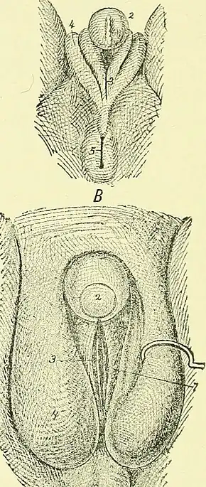 - chez l'embryon mâle, le tubercule génital prend une forme phallique et l'invagination urétrale se ferme sur le raphé périnéal médian, alors que les plis labioscrotaux latéraux forment les bourses et s'intègrent dans les sillons génito-cruraux. Cette différenciation sexuelle est induite par le gène TDF (testis determining factor) porté par les chromosomes Y, et par l'antigène H-Y (en quelque sorte inhibiteur des caractères féminins). De la testostérone est sécrétée par les cellules de Leydig et les cellules de Sertoli sécrètent l'hormone antimüllérienne ; c'est alors que la gonade primitive se transforme alors en testicule, et que le gland se forme autour de la partie terminale du canal de Wolff (qui engendre l'urètre dont le méat sera au milieu du gland)[11].