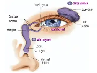 L'appareil lacrymal est constitué des glandes lacrymales qui sécrètent les larmes et le liquide lacrymal, et d'un système de drainage, les voies lacrymales.