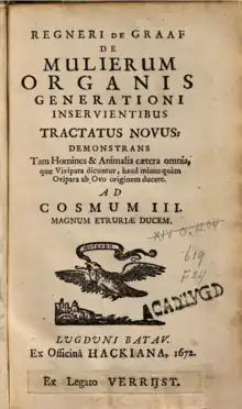 1. (la) Régnier De Graaf, De mulierum organis generationi inservientibus tractatus novus : demonstrans tam homines & animalia caetera omnia, quae vivipara dicuntur, haud minus quàm ovipara ab ovo originem ducere : ad Cosmum III, magnum Etruriae ducem., Lugduni Batavorum : Ex officina Hackiana, , 396 p. (lire en ligne)