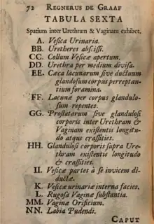 Légende de l'illustration anatomique N°6 : « GG : Prostatarum sive glandulosi corpori inter urethram et vagina existensis longitudo et crassities. » : GG : La longueur et l'épaisseur de la prostate ou du corps glandulaire existant entre l'urètre et le vagin.