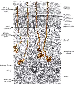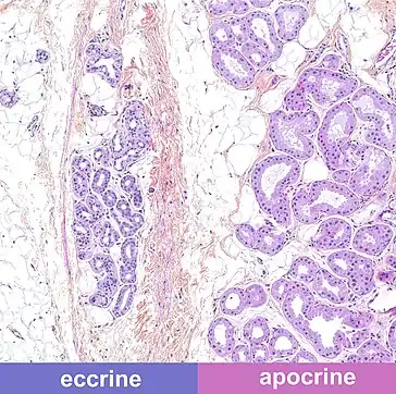 Histologiquement, il s'agit de glandes exocrines (épithéliums cubiques bistratifiés) dont la fonction première est la transpiration. On distingue chez les mammifères trois types de glandes sudoripares : les glandes eccrines, les glandes apocrines et les glandes sébacées. Ces deux dernières constituent les deux principaux types.