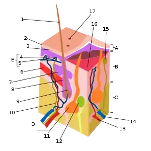 Position des glandes sudoripares (no 11, couleur orange) dans la peau :