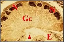 D’autre part, les cellules sécrétrices possèdent un noyau basal et sont toujours pleines de boules de sécrétion bien individualisées (3 μm). Leur chondriome est très peu développé. De plus, la pièce terminale est inexistante, la lumière est mince et se continue par celle d’un conduit constitué de chitine (polysaccharide azoté, principal constituant de la cuticule des Insectes normalement)[14].