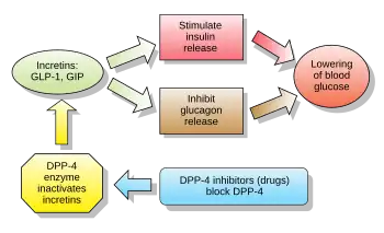 Les incrétines sont des analogues de synthèse du GLP1. Les gliptines sont des inhibiteurs de la dipeptidyl peptidase-4 augmentant le taux sanguin et l'activité du GLP1. Ces deux classes de médicaments sont utilisés dans le traitement du diabète de type 2.