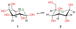 Il existe deux formes chaise selon que l'hydroxyméthyle est en position équatoriale (1) ou polaire (2), appelées respectivement « 4C1 » et « 1C4 » (ici avec le β-D-glucopyranose).