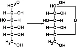Addition nucléophile de l'aldéhyde en C-1 sur l'hydroxyle en C-5 donnant le cycle pyranose du glucopyranose.