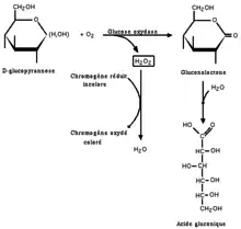 • dosage par la glucose oxydase. Cette méthode enzymatique utilise la glucose oxydase d'Aspergillus niger. Le glucose est oxydé par l'oxygène de l'air en δ-gluconolactone, puis en acide gluconique, avec production de peroxyde d'hydrogène H2O2. C'est en fait ce dernier qui est dosé par colorimétrie. En présence d'une peroxydase, le peroxyde oxyde un chromogène réduit dont l'absorbance est mesurée avec un spectrophotomètre. Le chromogène pourrait être du phénol et de la 4-aminophénazone oxydés en quinone-imine. Dans d'autres techniques, le peroxyde d'hydrogène est oxydé au niveau d'une électrode, le courant produit étant proportionnel à la concentration de glucose. Cette méthode est utilisée en biochimie médicale pour mesurer la glycémie du plasma sanguin.