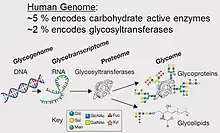 On parle parfois de glycomique (glycomics pour les anglophones), par analogue à génomique et à la protéomique pour désigner l'étude systématique de tous les glycanes des structures d'un type cellulaire donné ou d'un organisme. C'est un sous-ensemble de la glycobiologie[1].