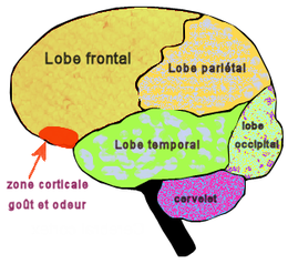 Dans tous les cas, cette dépolarisation induit la libération d'un neurotransmetteur agissant sur un neurone sensitif, qui achemine les potentiels d'action vers le cerveau[2]. C'est ensuite au niveau du cortex cérébral, dans la région préfrontale du cerveau, que toutes ces informations, et celles de l'odorat, sont traitées par l'organisme. Le cerveau parvient à percevoir les saveurs complexes en intégrant les stimuli distincts des différents types de récepteurs[2].
