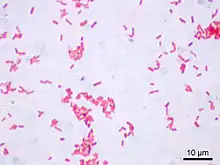 • la lame, après avoir été rincée, est plongée brièvement dans un deuxième colorant, la fuchsine (1 minute). Ce colorant traverse toutes les parois et membranes et va colorer en rose toutes les bactéries qui ont été décolorées durant l'étape précédente ; les bactéries Gram positif étant colorées en violet (plus sombre) n'apparaîtront pas rose (plus clair).